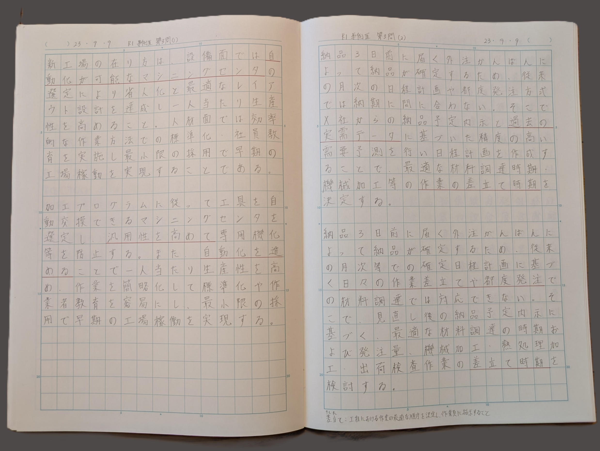8年分の過去問は、二次を受けられなかった2年目に一通り解いており(Ⅳも含め勉強時間227時間)、10月末の二次本番に向けて、8月から回答の写経を開始しました。写経ノートに記載された日付を見ますと、8/8~9/24までやってました。結構時間かけてますね。写経は通信講座と市販参考書の二つの回答を並べて写していました。写経に効果あるの?と最初は半信半疑でしたが、想像以上に効果ありましたね。同じ設問でも二つの回答が全然違う場合もあり、設問要求の意図や、使える表現が自然と身に付きました。それと大きな副産物として、字がきれいになりました。私はお世辞にも字が上手ではないのですが、人が採点する記述は汚い字だと印象が悪くなると考え、写経を通じて字をきれいに書くことを意識しました。今写経ノートを見返しても、自分とは思えないぐらい丁寧な字だと思います。